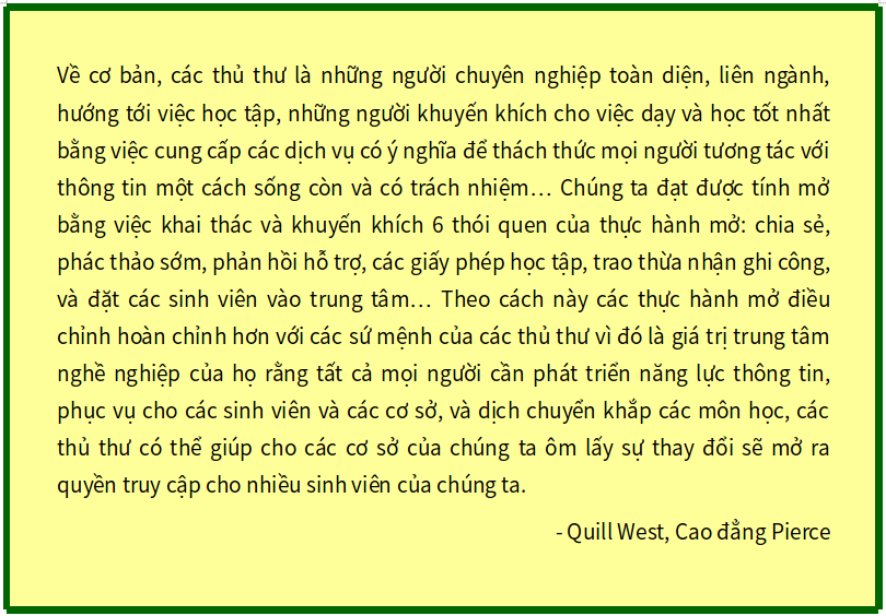 Bất kỳ cuốn sách nghiêm túc nào về mở cũng có thể là chưa hoàn chỉnh khi chưa đưa vào quan điểm của các thủ thư. Các thư viện từ lâu là các kho học tập được điều chỉnh mạnh mẽ với triết lý mở. Trong chương này, tác giả Quill West nói về những khát vọng cao ngất của giáo dục mở. Một cách thích thú, bình luận của bà là thực dụng hệt như nó được lý tưởng hóa. Bà chào sự thấu hiểu thực tế trong các cách thức khác nhau các giảng viên vấp phải với mở. West là người có óc thực tế khi bà thừa nhận rằng không phải tất cả các tư liệu mở sẽ làm thỏa mãn mọi kết quả đầu ra học tập của khóa học. Những thiếu hụt, ở những nơi chúng tồn tại, thường có thể được giải quyết nhưng nhiều giảng viên còn chưa chắc chắn chính xác làm điều này như thế nào. Bà coi tính mở - từ việc xuất bản tư liệu mở cho tới việc thừa nhận ghi công cho những người khác - như là năng lực có thể học được.
