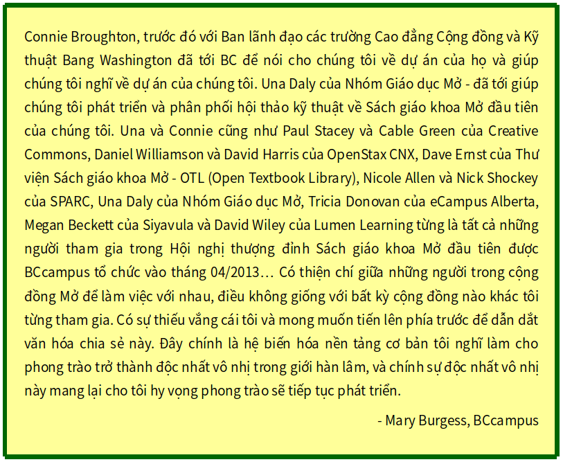 Là bản dịch của tài liệu: Burgess, M. 2017. Dự án Sách giáo khoa Mở của BC. Trong: Jhangiani, R S và Biswas-Diener, R. (eds.) Mở: Triết lý và các Thực hành đang Cách mạng hóa Giáo dục và Khoa học. Các trang 227-236. Luân Đôn: Ubiquity Press. DOI: https://doi.org/10.5334/bbc.r. Giấy phép: CC BY 4.0.