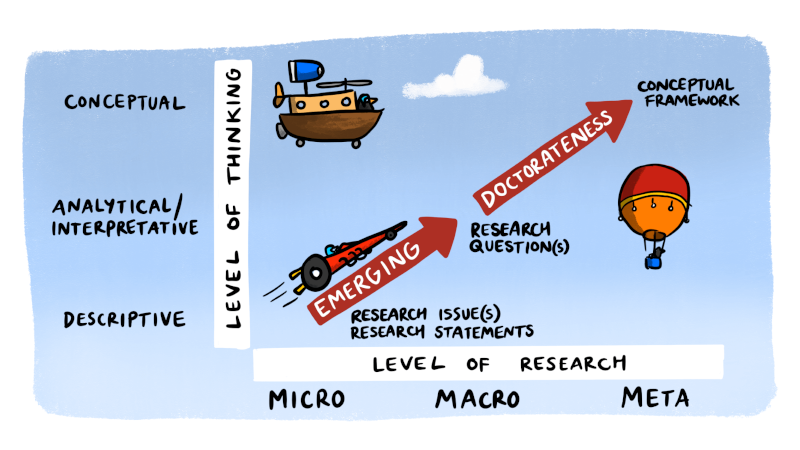 Mặt trái của vấn đề này liên quan đến việc lựa chọn một khung khái niệm. Để một khung khái niệm có thể hỗ trợ đầy đủ việc thể hiện “tính chất tiến sĩ” (doctorateness) trong một dự án nghiên cứu, nó phải có khả năng hỗ trợ một mức độ phản tư tương đối tinh vi. Nó cần bao gồm một loạt các vấn đề cần xem xét ở mức độ sâu phù hợp nhưng không được quá rộng đến mức thiếu trọng tâm.