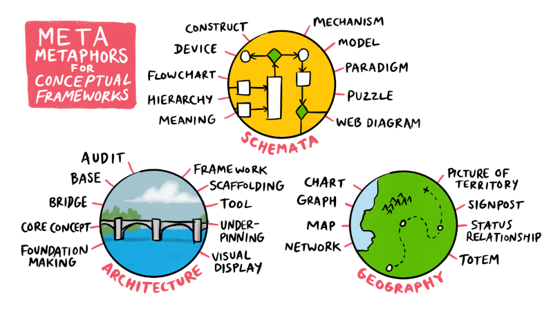 Leshem & Trafford (2007) chỉ ra rằng những phép ẩn dụ như thế này là những cách phổ biến để cố gắng mô tả một khung khái niệm - đến mức chúng thường thay thế chính khung khái niệm đó. Điều này có nguy cơ khiến khung khái niệm trở thành thứ che khuất hơn là làm sáng tỏ. Họ xác định ba nhóm ‘siêu ẩn dụ’: kiến trúc, địa lý và sơ đồ.