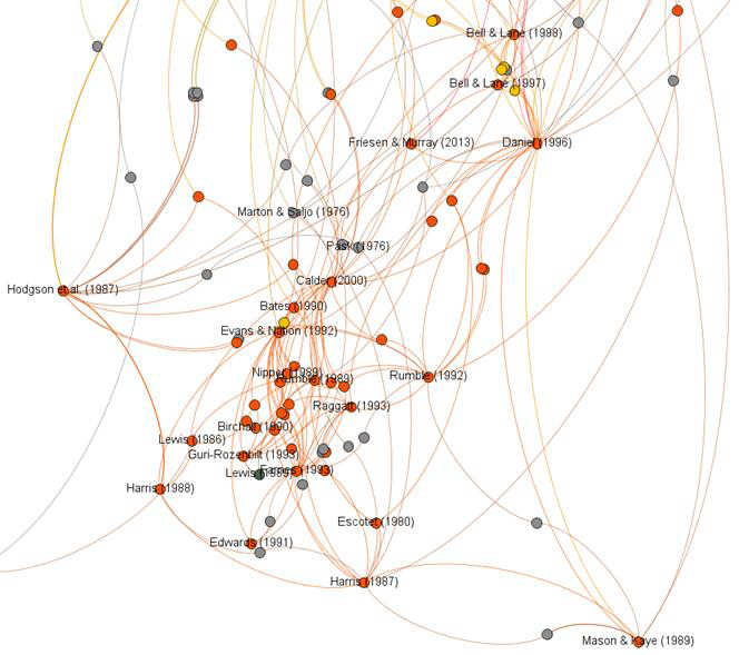 Các khung lý thuyết được trình bày ở đây là phương tiện để tích hợp các phát hiện nghiên cứu vào lý thuyết. Một cách tiếp cận khác là áp dụng lập trường định lượng, trung lập hơn và thông qua khai thác và phân tích dữ liệu, cho phép một khung lý thuyết hình thành. Một trong những cách tiếp cận đó là sử dụng phân tích trích dẫn hoặc phân tích mạng xã hội – SNA (Social Network Analysis).