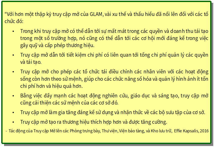 Là tài liệu của tác giả Effie Kapsalis, xuất bản ngày 27/04/2016. Tài liệu đưa ra những cái mất và được khi các Phòng trưng bày, Thư viện, Kho lưu trữ, & Viện bảo tàng – GLAM (Galleries, Libraries, Archives, & Museums) đi theo OpenGLAM, đặc biệt là ví dụ về hơn 50 cơ sở như vậy, hầu hết ở châu Âu và nước Mỹ.