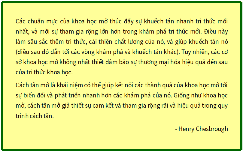 Là tài liệu của tác giả Henry Chesbrough, do ©Science|Business Publishing xuất bản năm 2015. Tài liệu giải thích vì sao Khoa học Mở cần đi song hành với Cách tân Mở để có thể đưa và tri thức mới nhanh nhất tới được thị trường với các mô hình kinh doanh mới, sáng tạo.