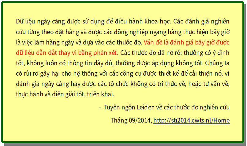 “Sự lạm dụng các thước đo nghiên cứu đã trở nên quá phổ biến tới mức không thể bỏ qua. Chúng tôi vì thế trình bày Tuyên ngôn Leiden, được đặt tên sau hội nghị ở đó nó được kết tinh (xem http://sti2014.cwts.nl).”