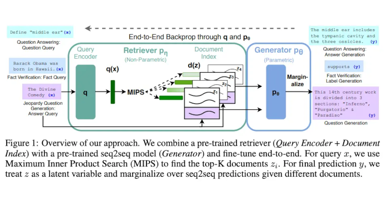 Lewis và cộng sự, (2021) đã đề xuất một công thức tinh chỉnh đa năng cho RAG. Một mô hình seq2seq được đào tạo trước được sử dụng làm bộ nhớ tham số và một chỉ mục vectơ dày đặc của Wikipedia được sử dụng làm bộ nhớ phi tham số (được truy cập bằng bộ truy xuất thần kinh được đào tạo trước). Dưới đây là tổng quan về cách thức hoạt động của phương pháp này: