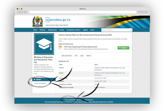 Giống như Chính phủ Singapore, giấy phép dữ liệu mở của Tanzania cũng có thể khó định vị.