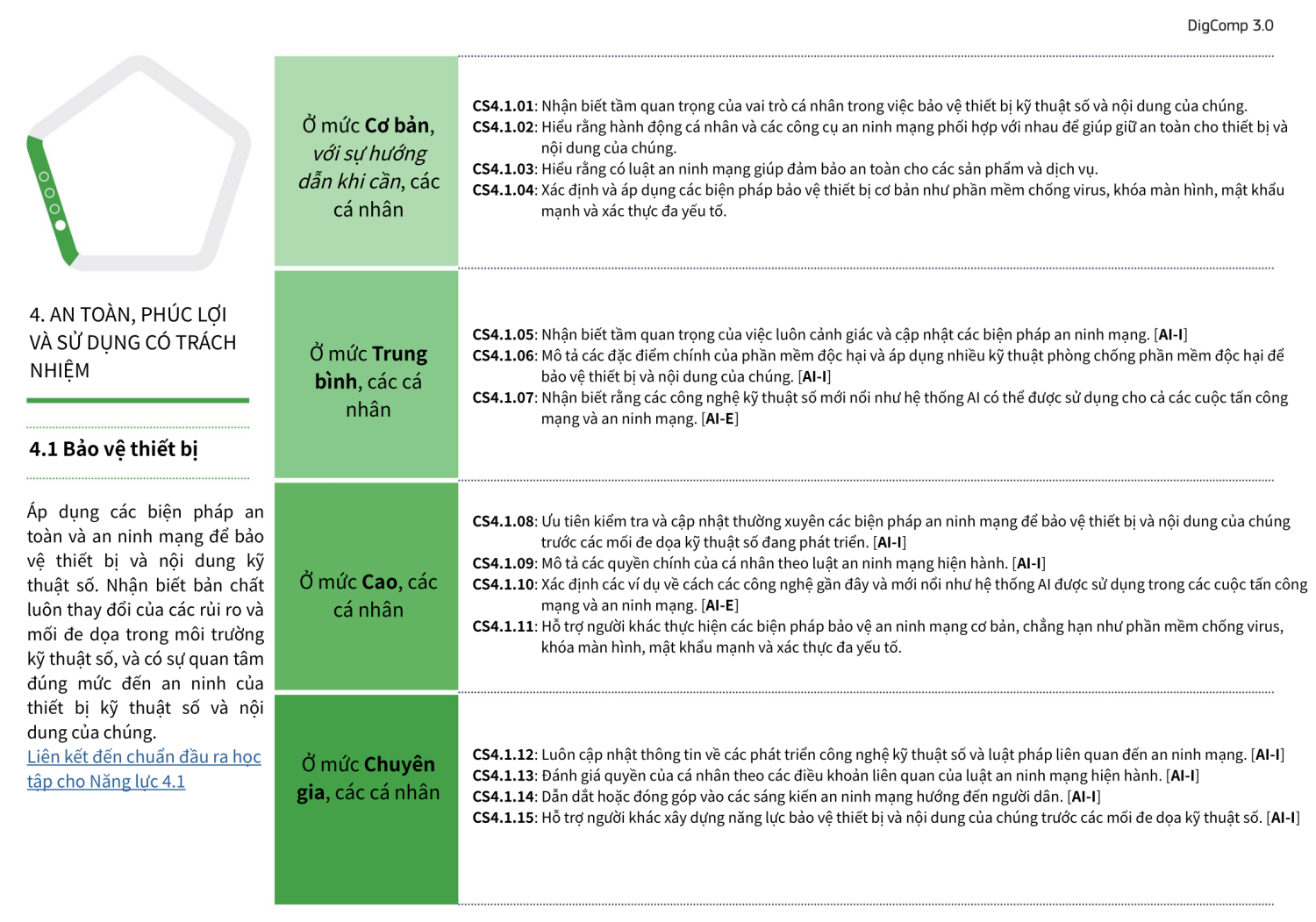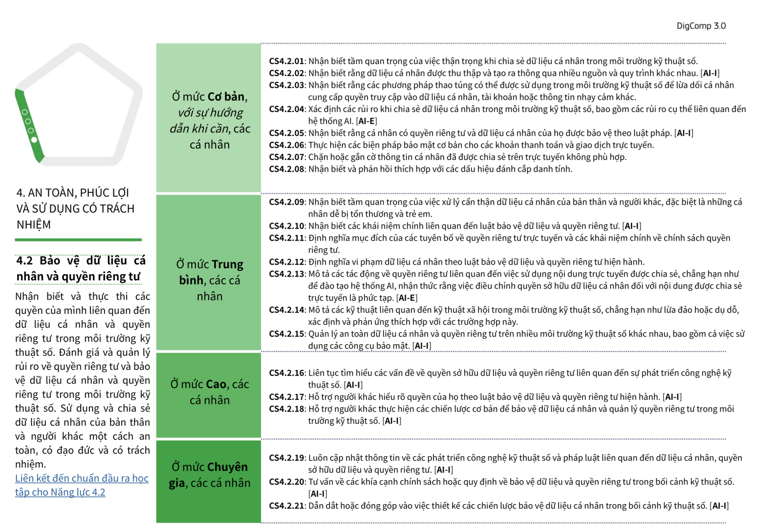Nội dung này được dịch từ tài liệu của Cosgrove, J. và Cachia, R., DigComp 3.0: Khung năng lực kỹ thuật số Châu Âu - Phiên bản thứ năm, Văn phòng Xuất bản của Liên minh Châu Âu, Luxembourg, 2025, https://data.europa.eu/doi/10.2760/0001149, JRC144121.