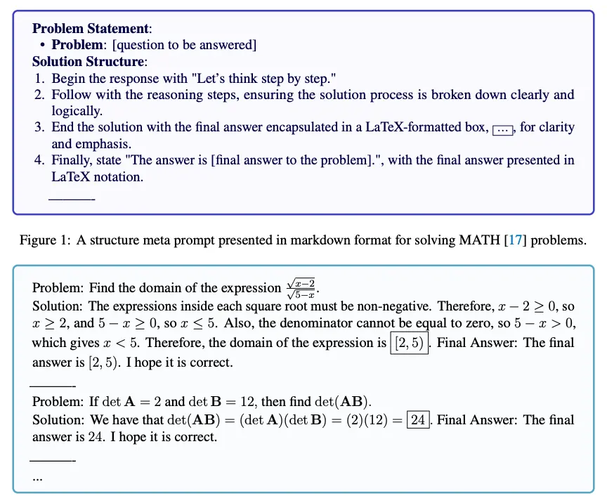 The following example obtained from Zhang et al. (2024) demonstrates the difference between a structured meta prompt and a few-shot prompt for solving problems from the MATH benchmark: