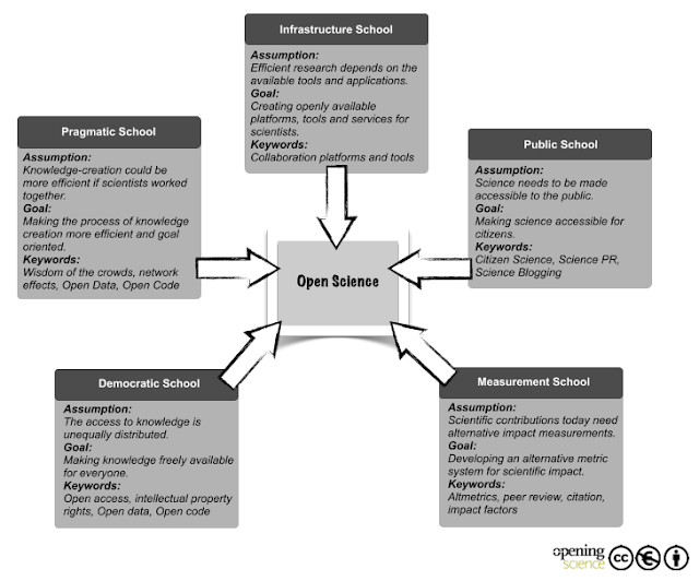 Lý lẽ đằng sau Khoa học Mở là phức tạp nhưng một trong những lý lẽ chính là xã hội học: tri thức khoa học là sản phẩm của sự cộng tác xã hội và mối quan hệ của nó thuộc về cộng đồng đó. Từ quan điểm kinh tế, các kết quả đầu ra khoa học được nghiên cứu nhà nước sinh ra là hàng hóa công cộng mà bất kỳ ai cũng nên có khả năng sử dụng không mất chi phí. Trong thực tế có nhiều tiếp cận đối với khái niệm và định nghĩa Khoa học Mở, điều Fecher và Friesike (2014) đã tổng hợp và xây dựng bằng việc đề xuất 5 trường phái tư duy Khoa học Mở (xem hình 3).