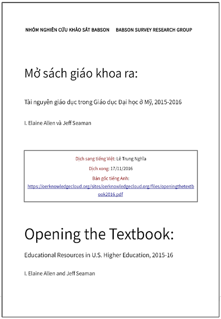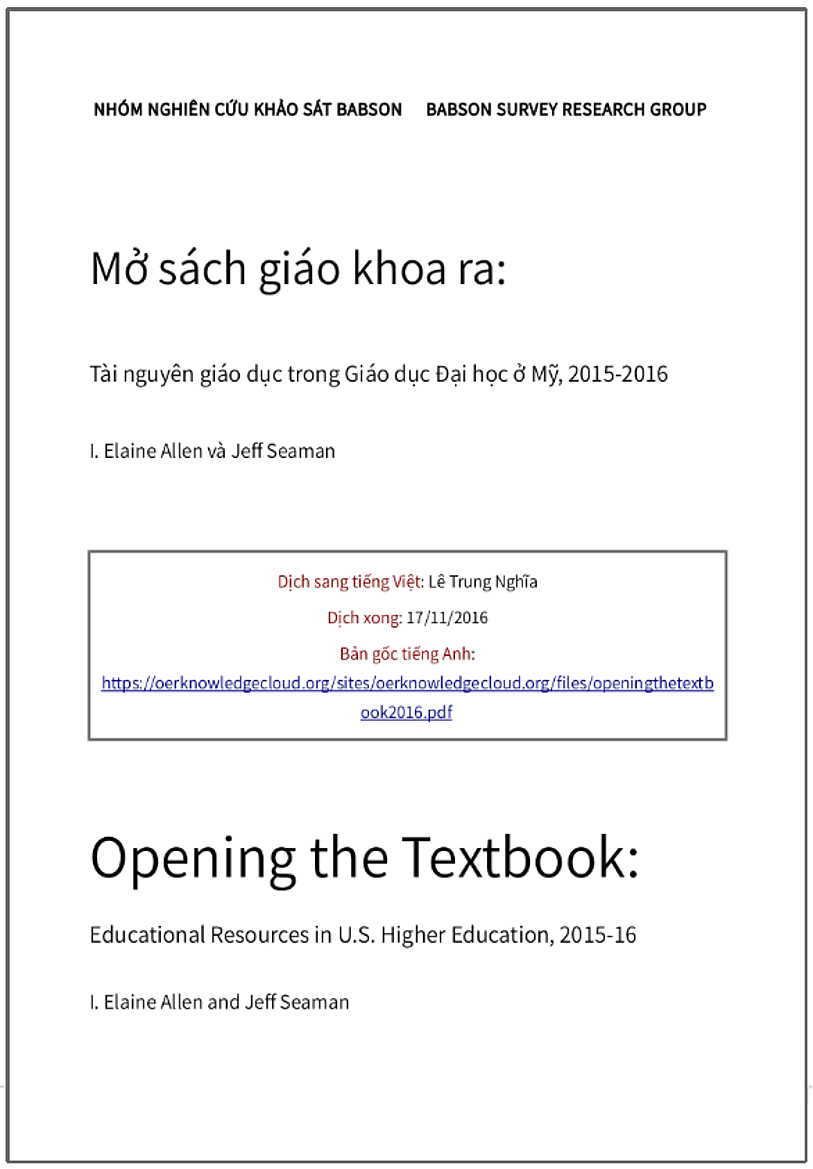 Đây là tài liệu do các tác giả I. Elaine Allen Jeff Seaman của Nhóm Nghiên cứu Khảo sát Bubson xuất bản vào tháng 7/2016 nêu thực trạng và đưa ra các khuyến cáo có liên quan tới tài nguyên giáo dục mở (OER) và sách giáo khoa mở ở nước Mỹ trong các niên học 2014-2015 và 2015-2016. Tài liệu có thể là tham khảo tốt cho những ai có quan tâm trong việc ứng dụng và phát triển OER và sách giáo khoa mở ở Việt Nam. Bạn có thể tải về bản dịch sang tiếng Việt, có 98 trang, tại địa chỉ: https://www.dropbox.com/s/ddg2b19k5244h77/Openingthetextbook2016-Vi-17112016.pdf?dl=0